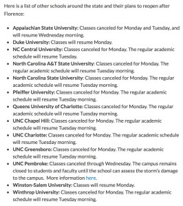 University plans in response to Hurricane Florence. Posted Sept. 16, 2018.