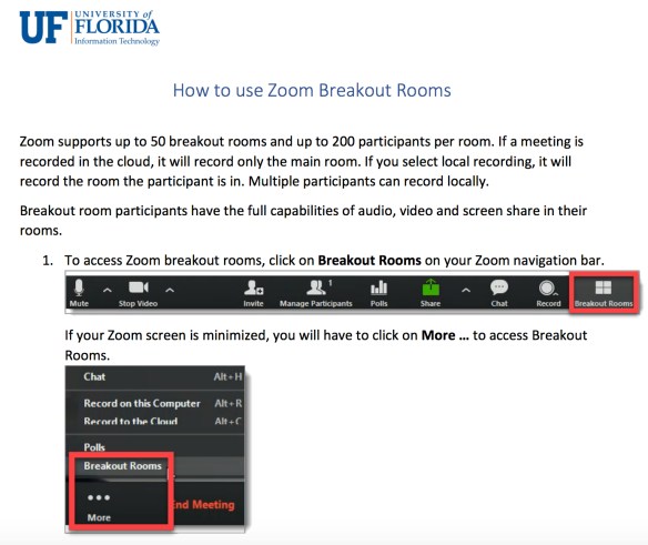 As a member of the University of Florida’s Graduate Student Teaching Awards Committee, I have observed graduate students utilizing Zoom breakout rooms in a wide range of subject areas. Whereas instructors typically only make brief visits to breakout rooms during class, I have been able to observe the full time students are in a breakout room.